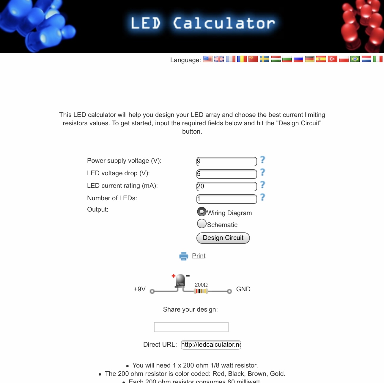 Assuming we are using a 9V battery, we can use the resistor calculator to work out the resistor we need for the circuit.