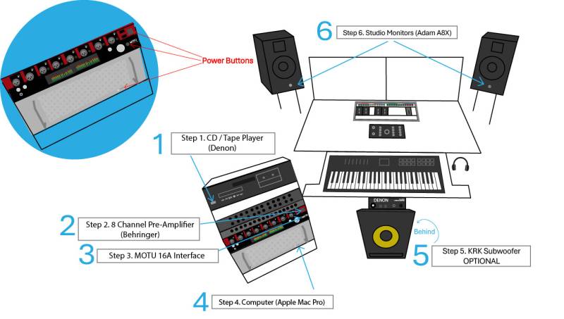 This order protects the speakers from voltage spikes during powering on and also ensures the software and computer recognise the connected equipment.