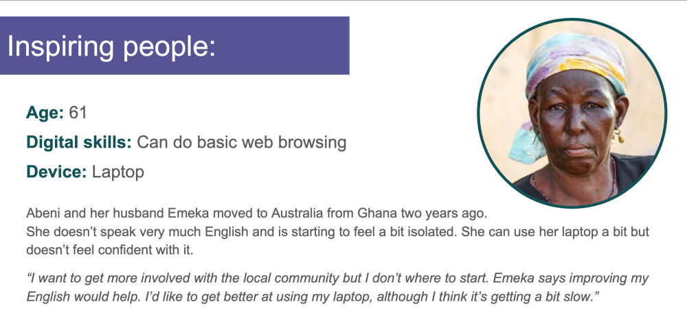 Show Abeni info online to improve her English, show website addresses and apps. Show her how to google so she can attend local community groups and meet with people face to face, this would also help to improve her English. Introduce Facebook to Abeni, she may be able to keep in touch with family who use Facebook. Go online to find the local newspaper to keep her informed of whats happening in her neighbourhood / community. Some libraries have weekly meetings for Conversational English for the community to come in and meet others and practice their English.
