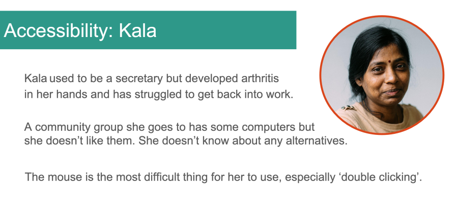 You could begin my showing Kala many different keyboard shortcuts that she may find easier than using a mouse or suggest a tablet may be better and show her how to use voice commands