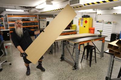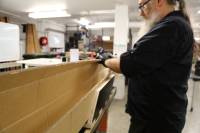 Next use the CNC machine with Donig creaser and drag knife attachments to make consistently measured crease lines in the cardboard and then cut the sheet to the beam size (3 beams per sheet), Theres foam bed fitted with end-stops to position sheets accurately to ensure a straight, squared creases and cuts. zip of VCarve File