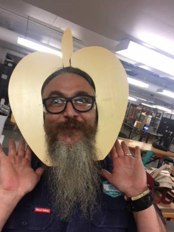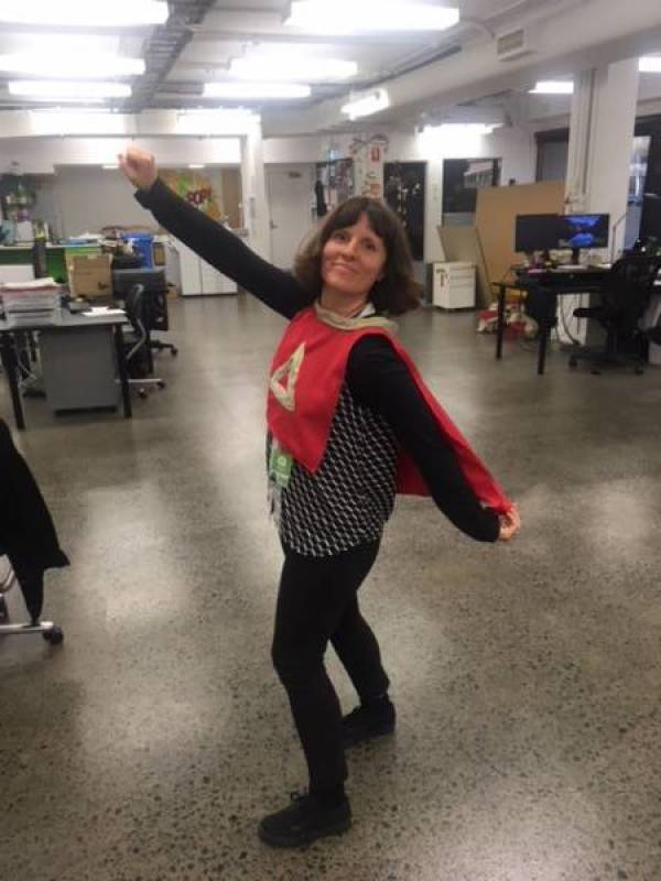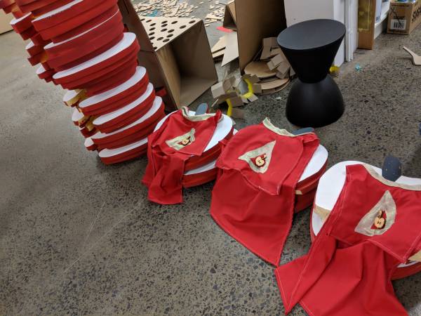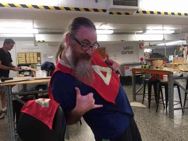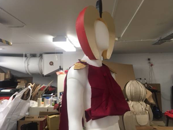 Toby an education student worked on the apple head along with Mick. The cape was worked on by Emma Che and Toby. After many iterations the helmet and cape that you see here was made.