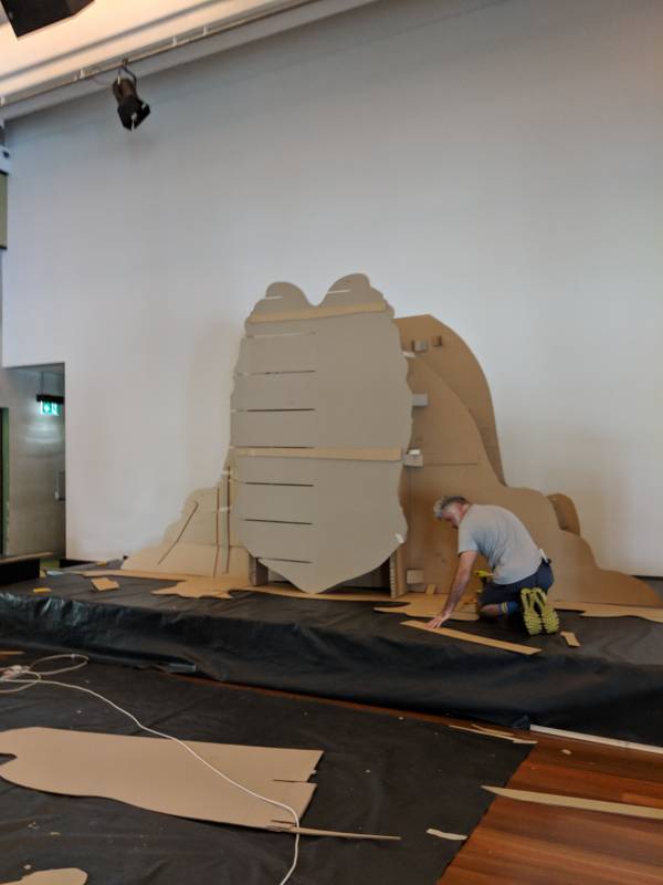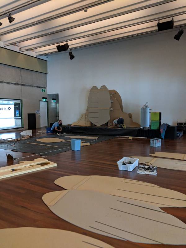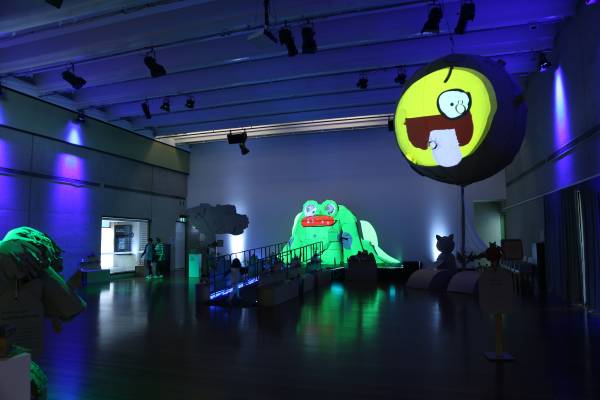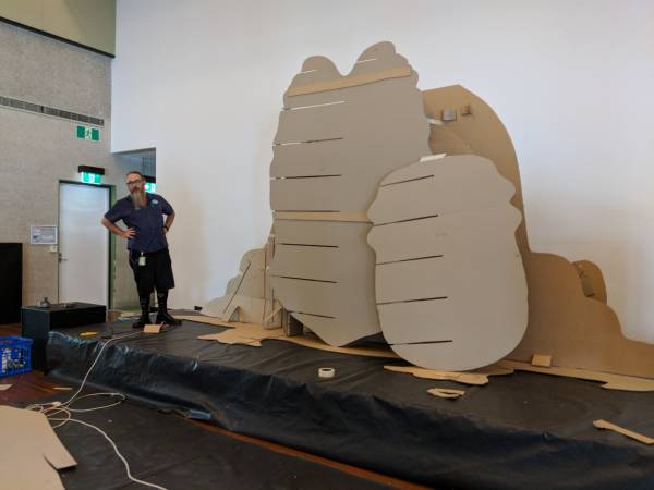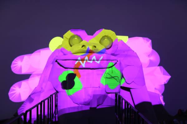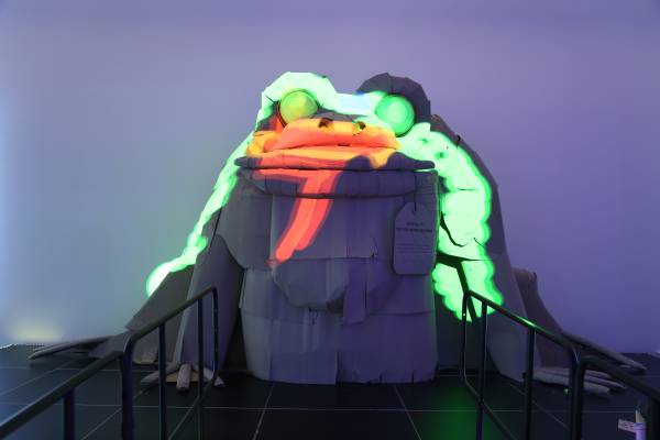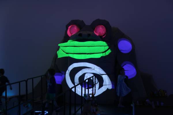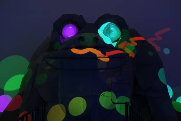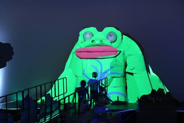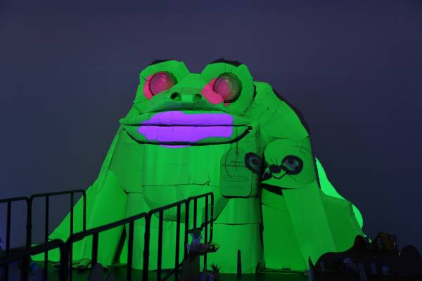 Bullfrog The design goes over the stage area. It's legs are on either side of the stage (part of the frame). Mouth is below top of the frame eyes and head above the top of the frame.