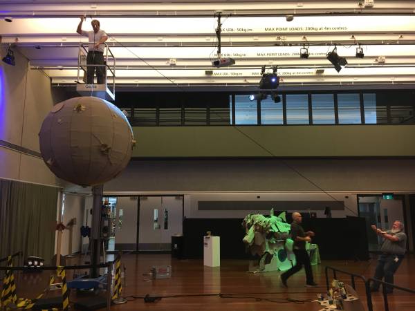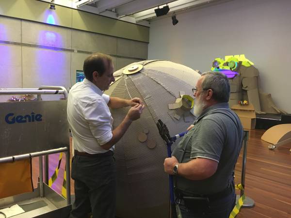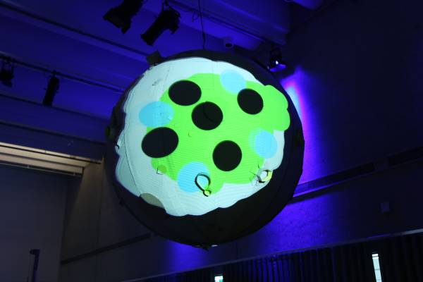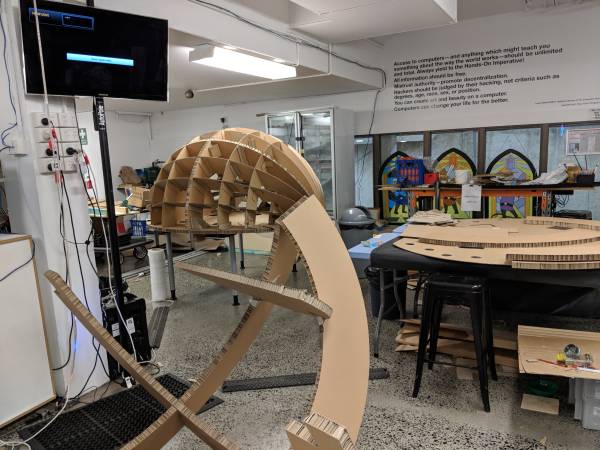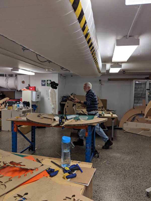 David designed the moon during a design session. The main moon structure was then cut on the CNC by Gregory. The moon wrap and craters was then cut out and made by young newly arrived migrants that came in with assistance from QPASTT.