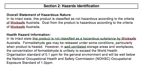 - Material Safety Data Sheet (MSDS/SDS) for the material. MSDS sheets can be obtained through Google searches or from http://www.msds.com. Examine the MSDS for ‘Hazards’ and ‘Hazard Identification’ sections, particularly hazards related to heating the material. For example from the Medium Density Fiberboard (MDF) MSDS: