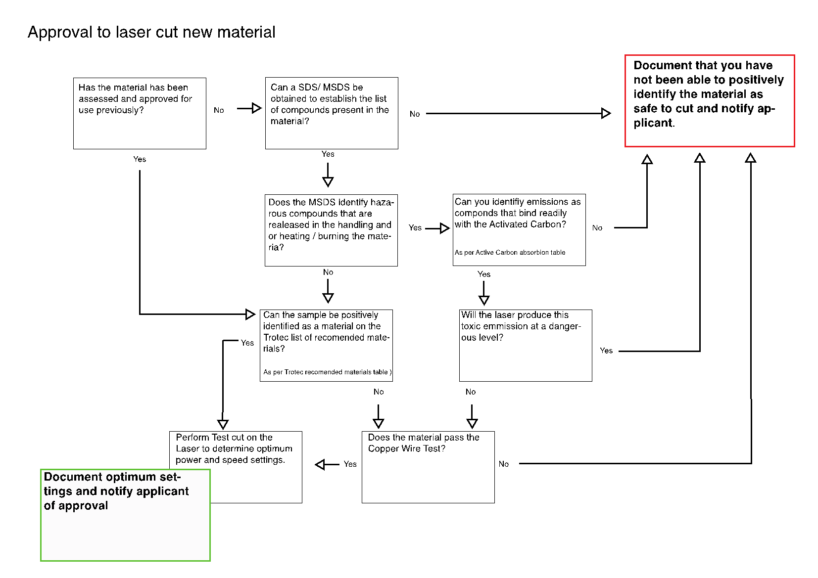 The following Flowchart describes the process an authorized supervisor can undertake to assess a new material for approval to be cut/ etched on the Edge’s Laser cutter.