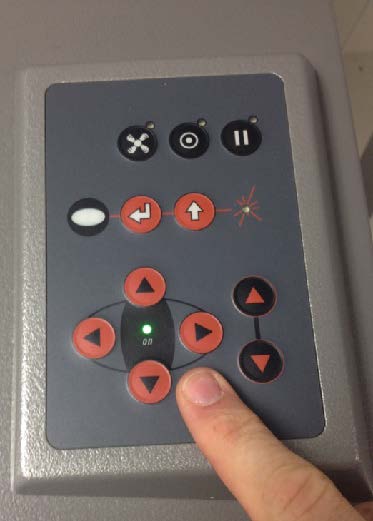Use the keypad to lower the bed. This prevents damage to the head when removing material. Wait… at least 30 seconds for the smoke to clear