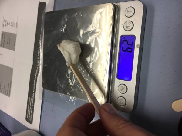 Process 1. put a plastic cup (if its going to be used straight away ) or a poly bag (if they aren't using it immediately) )onto the scales and zero the scales 2. Dig out a potion of Part A ( white ) with a paddle pop stick and place it into/on the cup/ polybag