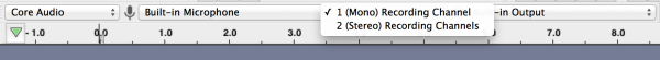 Also choose from the same menu whether you want to do a Mono or Stereo recording. So what’s the difference between mono and stereo? Well a mono recording is one where the sound in the left and right channels is the same, a stereo recording has different sounds in each channel. So unless you are getting creative with your recording, best to stick with mono. Here's a link to some good info on this side of things