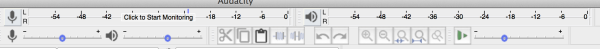 Audacity always launches with input monitoring off and so the Recording Meter Toolbar displays “Click to Start Monitoring”. Click in the recording meter to start monitoring, or when you press the The Record button Record button the meter will activate. The Recording Meter Toolbar again displays “Click to Start Monitoring” whenever you stop a recording or start playback.