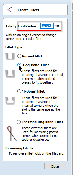 In order for our design to fit together straight of the machine - you may need to use dogbone fillets. This is a small arc on inside corners that fits the tool, and ensure a joint fits to its full length.