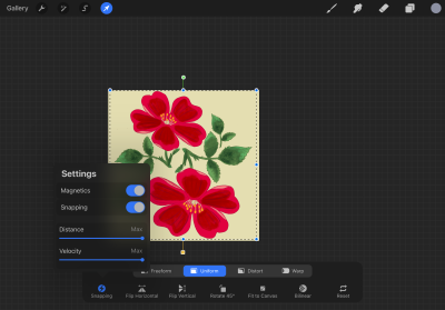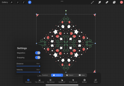 With this new layer selected, go to the Selection Transform tool, click on Snapping in the left-hand corner of the menu, and make sure that magnetics and snapping are turned on and that the distance and velocity are set to max.