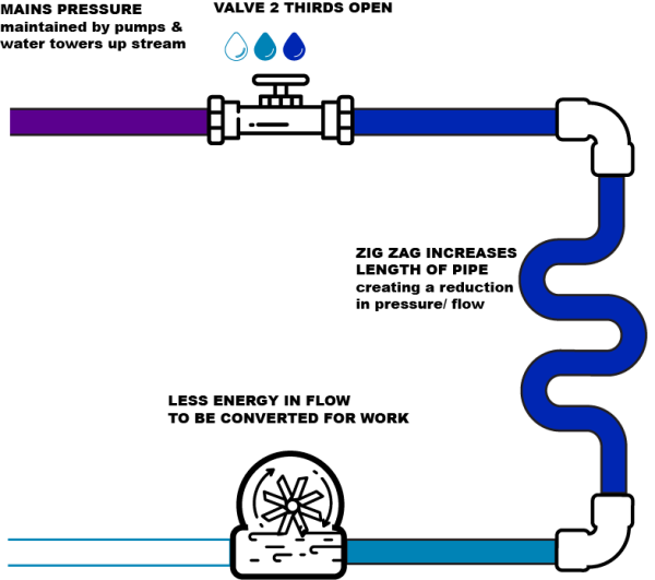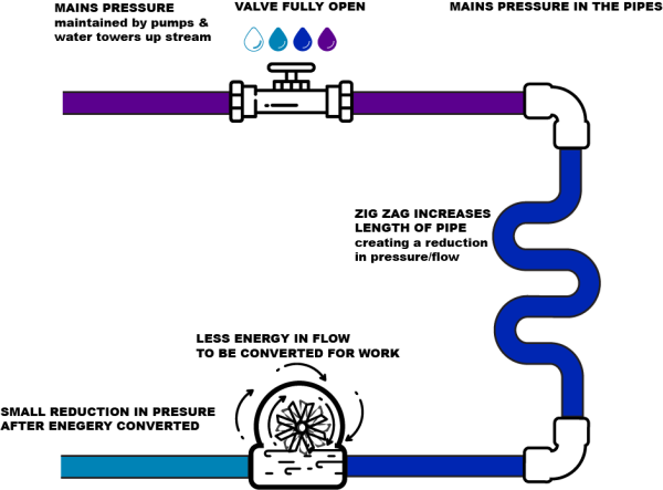 Of course our conductors and pipes aren't perfect - we lose a bit of energy getting it to where the work needs to be done. Think of it this way, you loose a bit of energy for every metre of pipe you run thru ( there's turblance & the friction of the water rubbing up against itself and the pipe- which turns into heat or vibrations or noise. This all eats into the energy we have for doing the work.