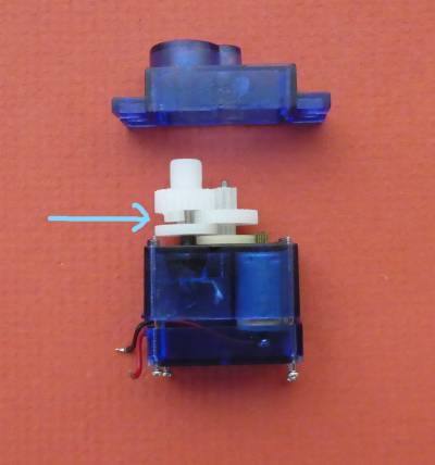 Standard mini-servos (like the 9G example used here) are designed to have their speed electronically controlled, and never to make a full rotation. The first constraint involves having a miniature PCB inside the servo, and a couple of extra wires that carry the control signals. The second constraint involves having a physical stop in place on one of the driving gears inside the servo. Both of these constraints will need to be removed for the servo to rotate continuously under control of a simple on/off switch for this project.