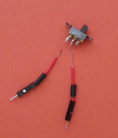 Do the same with the terminals of your switch - solder half a jumper to the central terminal, and half to one of the outer terminals. The switch will be on when the slider is moved towards the terminal with the wire attached, and this might influence the orientation of the switch later when it is screwed into place.