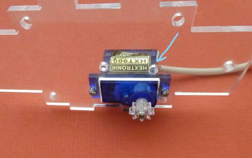 Now push the servo into the hole provided, with the cog to the right as shown. Fix in place with the two M2.5 x 10 screws. The screws will usually bite into the servo case and hold, but nuts may be added if extra firmness is required (or only one screw aligns with the hole in the acrylic).