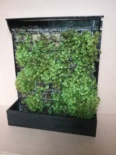 An initial prototype used a suspended moss wall, made up of open weave insulation material, sandwiched in a pocket of plastic mesh. Airflow to both sides of the growing medium seemed to make for very rapid drying, and a need for more regular watering. This new design, added the absorbent backing, used a more compacted rock wool substrate, and resulted in the wall having only one exposed side - all intended to reduce the water loss.