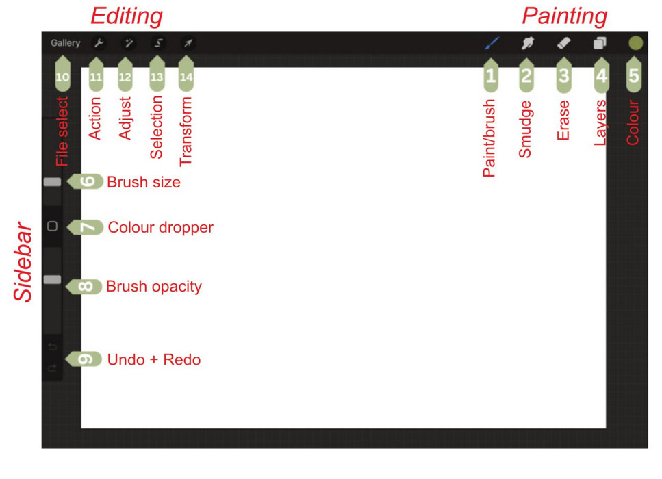 There are three sections of the Procreate interface. These three sections can be broken down into;