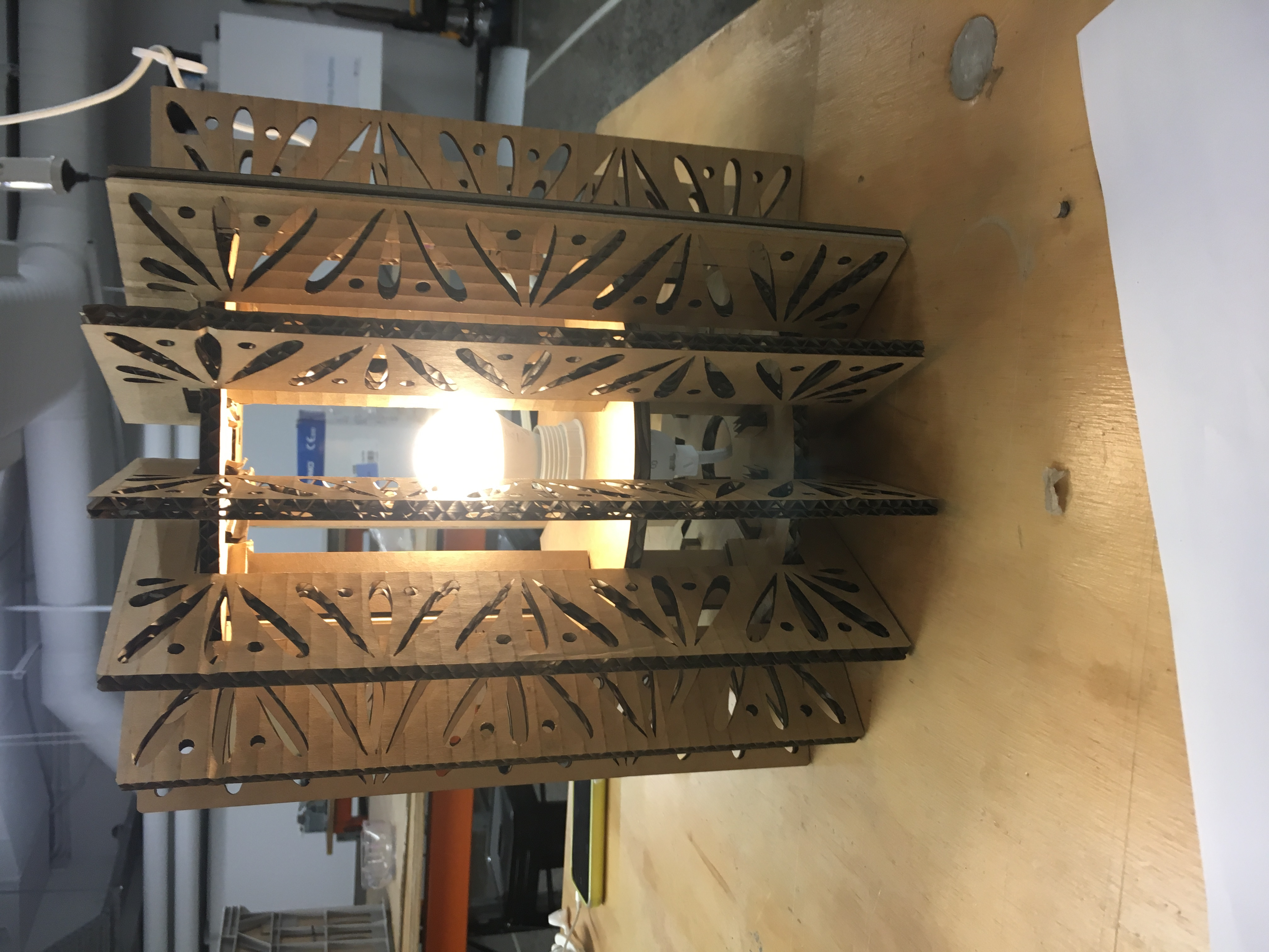 Could be used as a desk lamp by turning the design upside down and adding a notch for the power cord. In this instance would suggest securing the lead in the underside (tape or zip tie to the cardboard) and adding some weight the the underside as the base it relatively narrow and might easily tip.