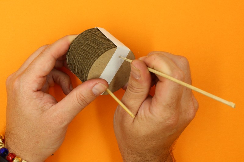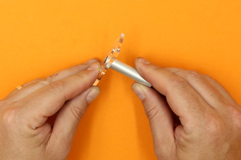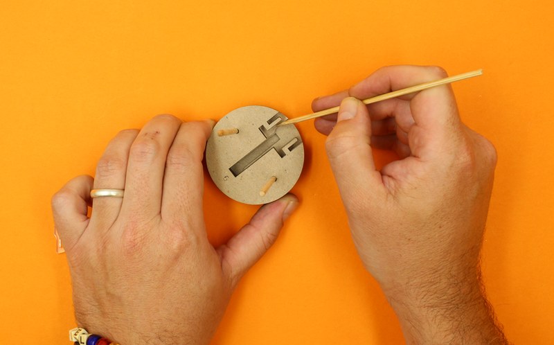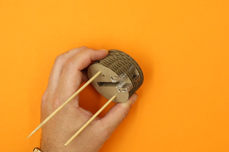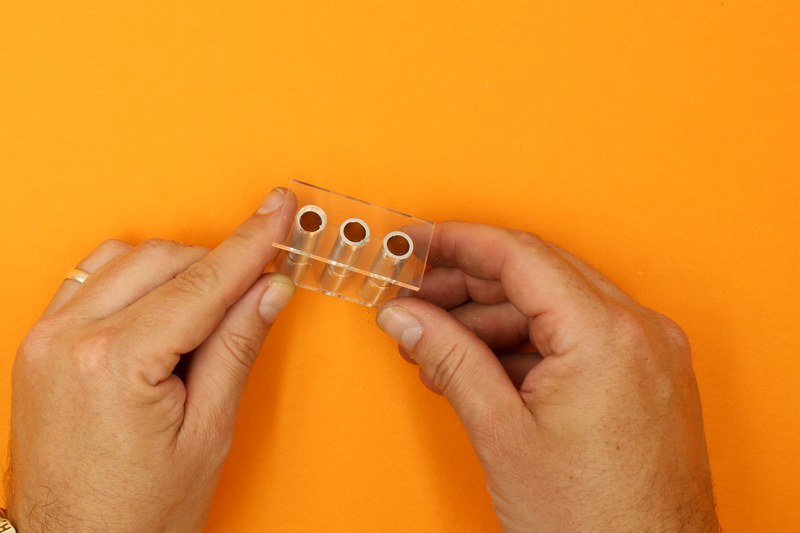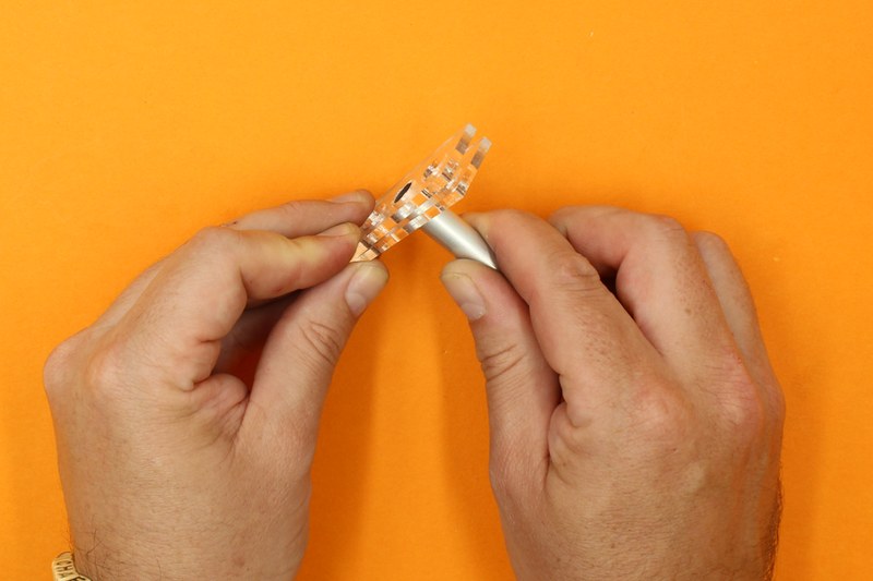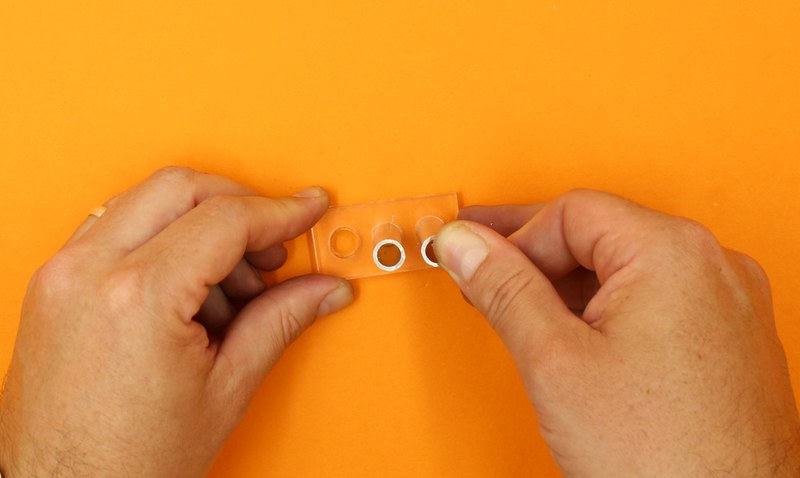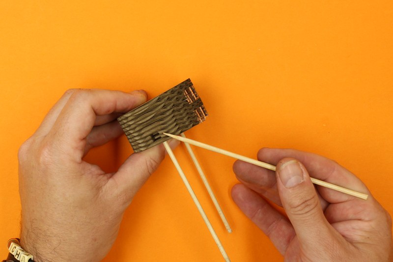 Add the plastic plug supports. Carefully use the pointy end of a skewer to nudge the plastic plug supports into place