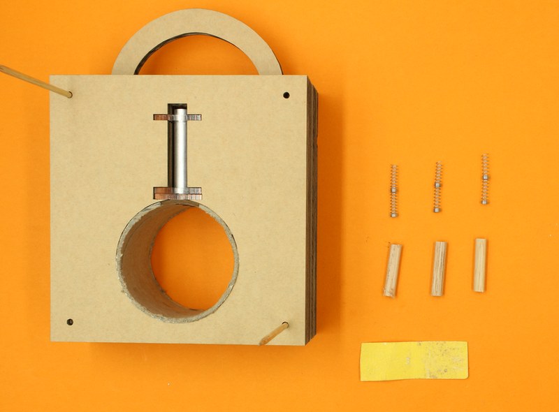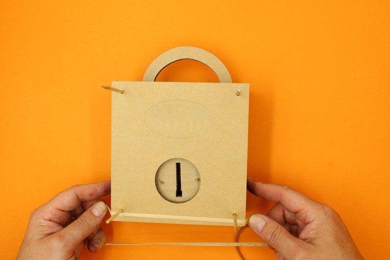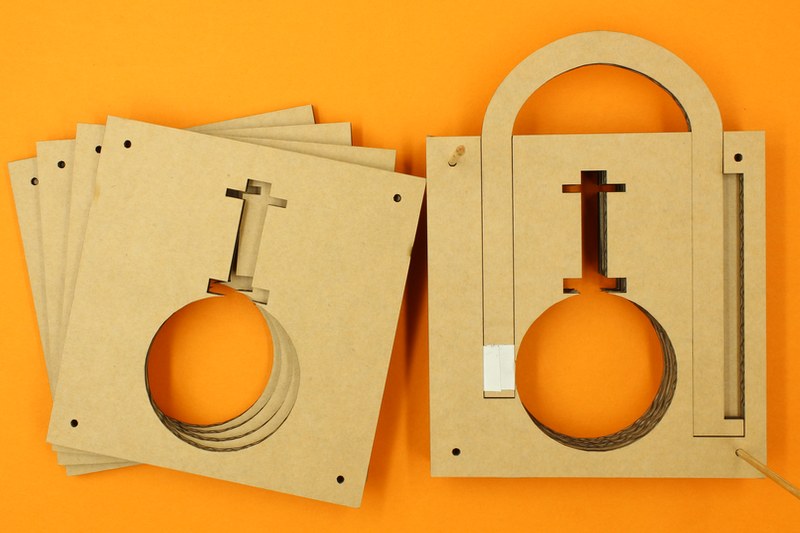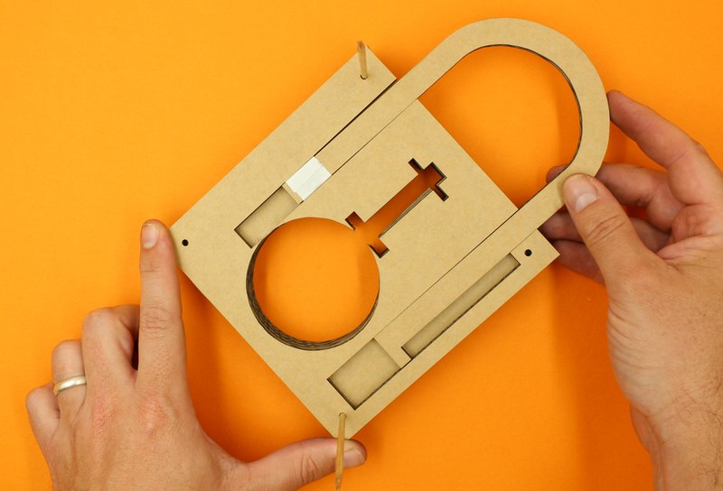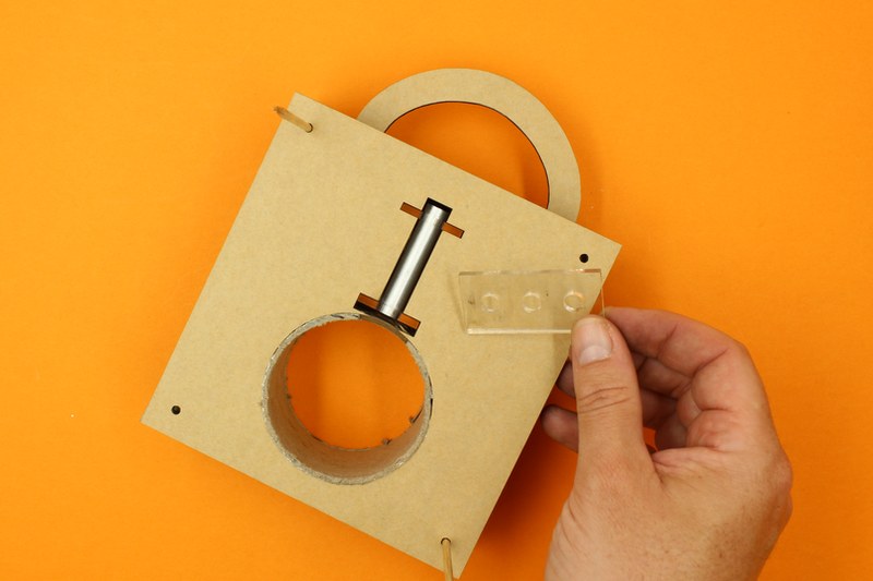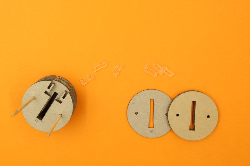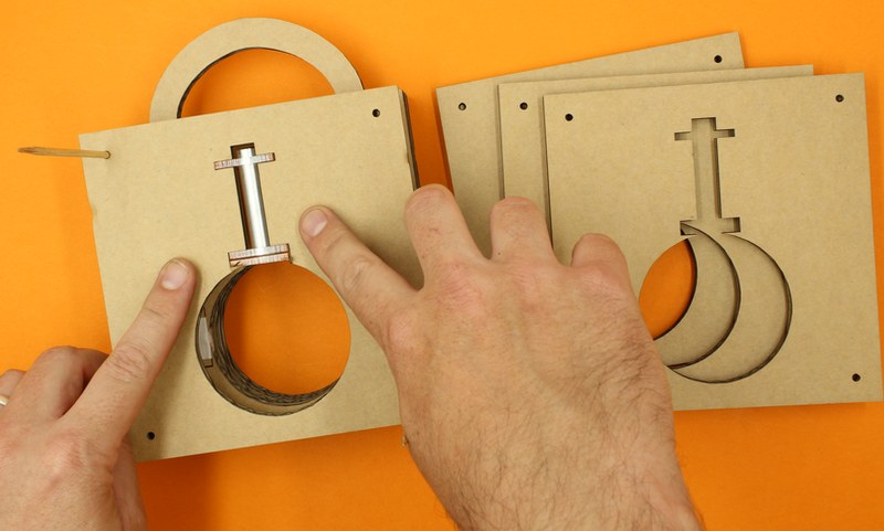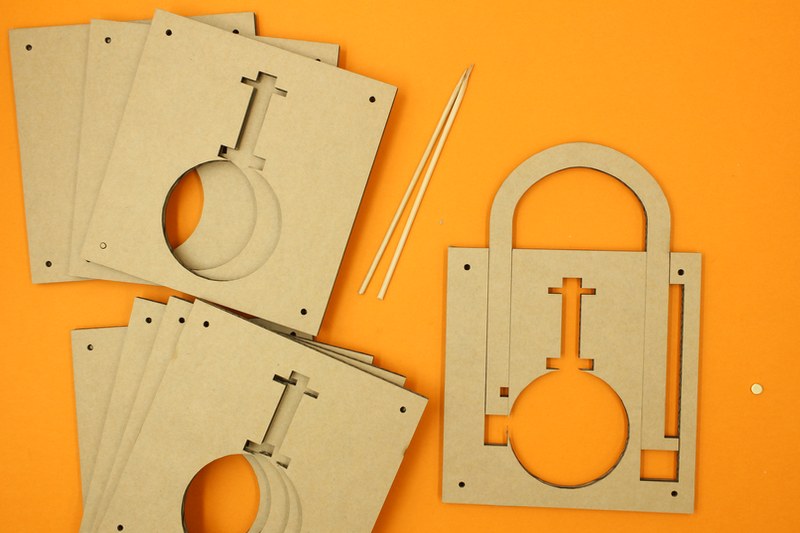 Just as we did with the Plug, start by aligning three of the Hull “Filler” plates on two of your skewers. Then add the Hasp layer of your lock.
