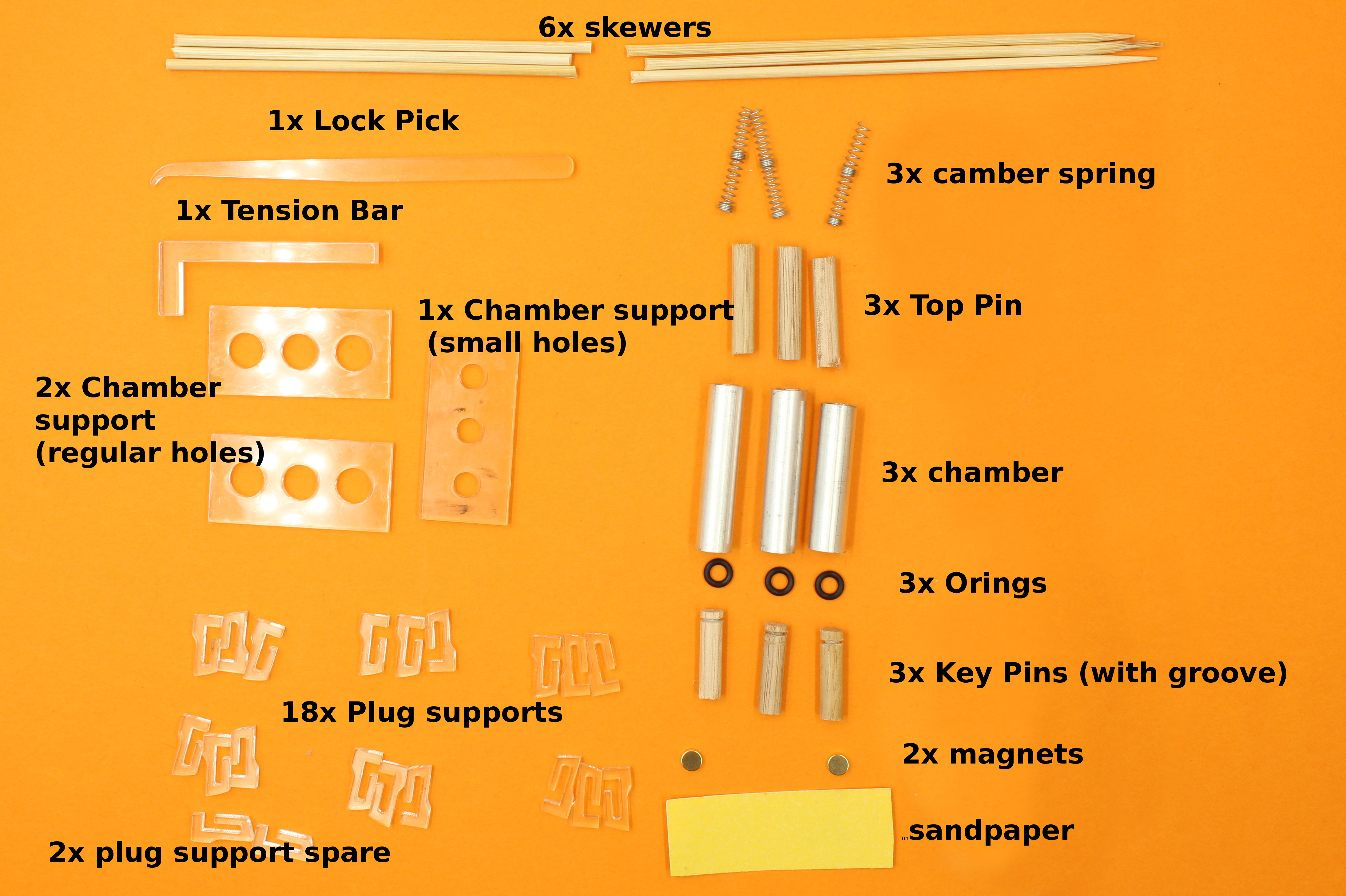 Your lock kit contains a pin tumbler lock set in a padlock. The padlock is held shut with magnets when locked.