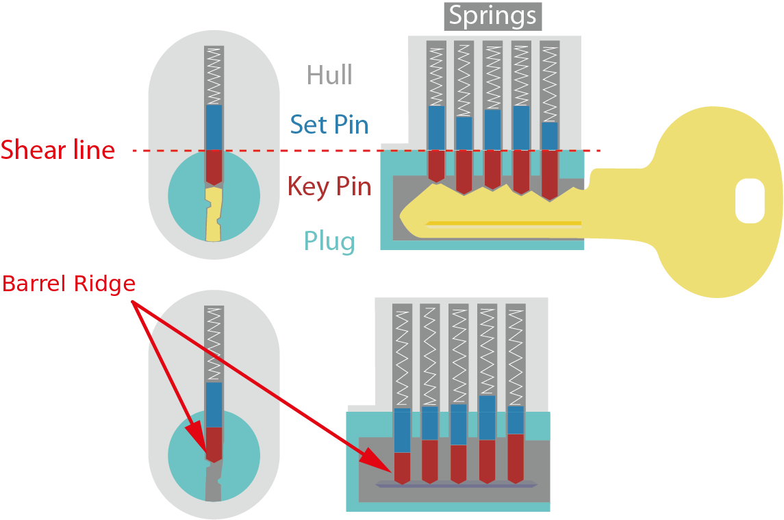 This means that we can't make a barrel ridge that will stand up to the test of picking. So we've modified the the mechanism, with Orings on the key pins to keep them in place when locked.